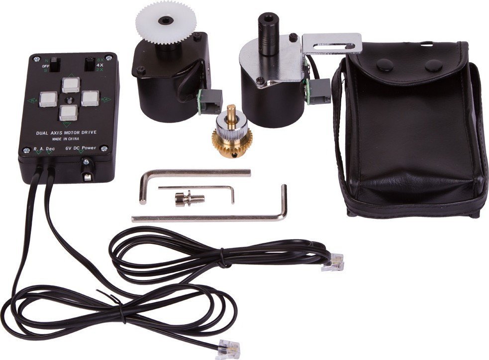 Полная комплектация | Электроприводы для двух осей, шестерни, соединительные кабели, пульт управления, батарейный блок, инструменты для сборки |