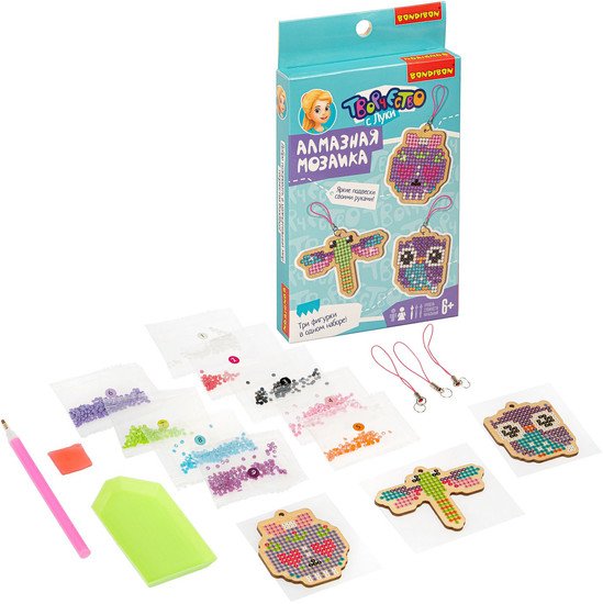 | Информация | ? Набор для творчества "Сова, Стрекоза, Череп" от ТМ Bondibon позволяет создать 3 деревянных брелока, украшенных стразами. ? Этот набор позволяет девочкам создать стильные брелоки собственными руками. ? Идеальный подарок для родителей, друзей или стильное украшение для ранца или ключей. ? В комплект входят подвески для брелоков. |