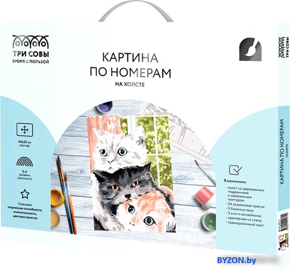 | Комплектация | • холст 40*50 см с нанесённым контуром; • акриловые краски на водной основе в пронумерованных баночках – 24 шт.; • баночка с глянцевым защитным лаком, созданным для покрытия готовой работы – 3 шт.; • кисть из эластичного нейлонового волокна – 3 шт.; • настенное крепление – 1 шт.; • тренировочный лист. |