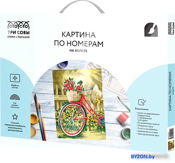 | Комплектация | • холст 40*50 см с профессиональной галерейной натяжкой и нанесённым контуром; • акриловые краски на водной основе в пронумерованных баночках – 24 шт.; • глянцевый защитный лак для покрытия готовой картины – 3 шт.; • 3 кисти из эластичного нейлонового волокна: малая круглая, средние круглая и плоская; • комплект настенного крепления – 1 шт.; • тренировочный лист. |