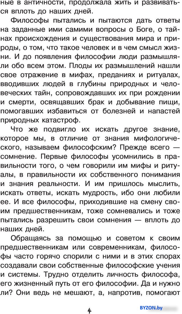 | Информация | - Книга Андрея Львовича Цуканова «Философия для любознательных» подойдет как школьникам 12-16 лет, так и студентам филологических вузов. В ней доступно рассказывается об основных направлениях философии, основных понятиях, учениях таких мыслителей, как Лао-цзы, Демокрит, Сократ, Платон, Аврелий Августин, Френсис Бэкон, Владимир Соловьев. - Вы узнаете, какие бывают добродетели, почему нельзя дважды войти в одну и ту же реку, почему человек есть «мыслящий тростник» и многое-многое другое. |