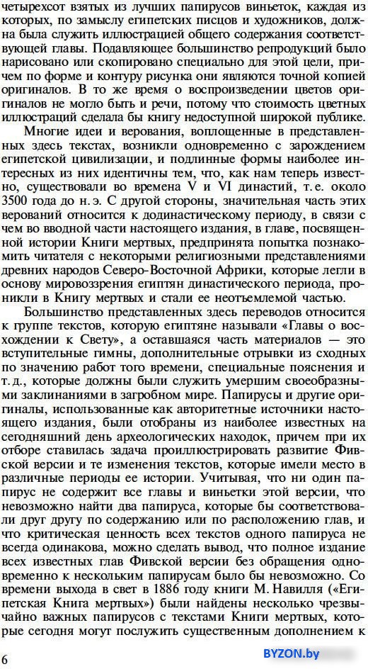 | Информация | - "Египетская книга мертвых" - символ Египта, так же важный, как и пирамиды, фараоны, мумии и Сфинкс. В течение 5000 лет она занимала важное место в жизни каждого египтянина, будь то фараон или пахарь, супруга фараона или ее служанка. Их надежда на вечную жизнь и счастье была основана на действенности гимнов, молитв и заклинаний этой книги. Главы "Книги мертвых" были путеводителем через смерть и погребение в царство света и жизни, в присутствие божественного Осириса. Прочтение этой великой и мудрой книги поможет понять, чем жил и дышал Древний Египет. |