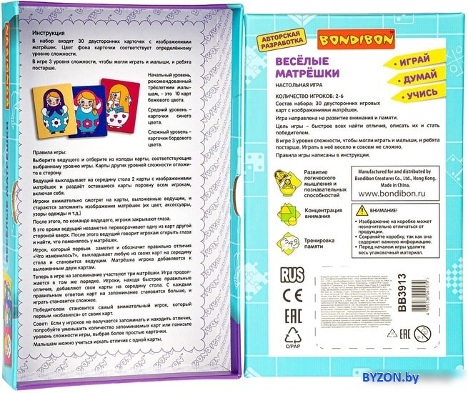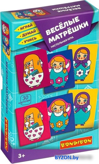 | Информация | Настольная игра «ВЕСЁЛЫЕ МАТРЕШКИ» серии «Играй, думай, учись» от Bondibon направлена на развитие внимания и памяти детей от 3-х лет. В ходе игры постепенно повышается уровень сложности. Всего их три, каждый уровень соответствует определённому цвету. Начальный уровень, рекомендованный детям от трёх лет, —карточки бежевого цвета. Средний уровень — карточки синего цвета. Сложный уровень — карточки бордового цвета.В начале игры ведущий выкладывает на середину стола 2 карточки и предлагает игрокам внимательно изучить и запомнить изображения на картах. Затем игроки закрывают глаза, а ведущий переворачивает карты и просит игроков открыть глаза. Задача каждого игрока —обнаружить и показать, что изменилось на картинках, опередив соперников. Игрок, который первым правильно нашёл и показал отличия, выкладывает любую из своих карт на середину стола и становится ведущим. Матрёшка игрока добавляется к выложенным двум картам, с каждым правильным ответом карт на запоминание становится больше, играть становится сложнее.Для самых юных игроков мы предлагаем начинать игру с одной карточки |