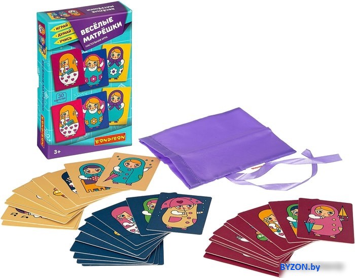| Комплектация | 30 двусторонних игровых карт с изображениями весёлых матрёшек, тканевый мешочек, с которым игру удобно взять с собой в гости или в путешествие. |
