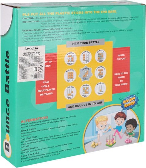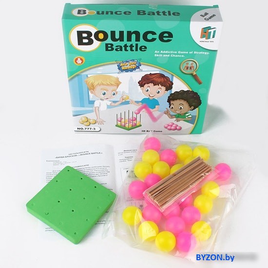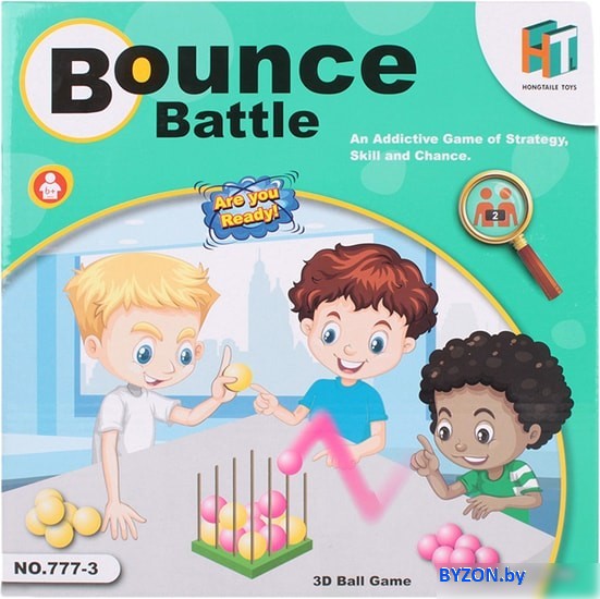 | Информация | Для победы в различных вариантах битвы необходимо бросить мячик таким образом, чтобы он отскочил от поверхности и попал в игровой куб. Поставьте игровой куб на стол или пол. Расположитесь рядом с кубом с противополжной стороны от вашего соперника (чем ближе, тем проще попасть мячиков в куб). Выберите цвет мячиков, определитесь с вариантом исхода битвы, приступайте к броскам и скачите к победе! |