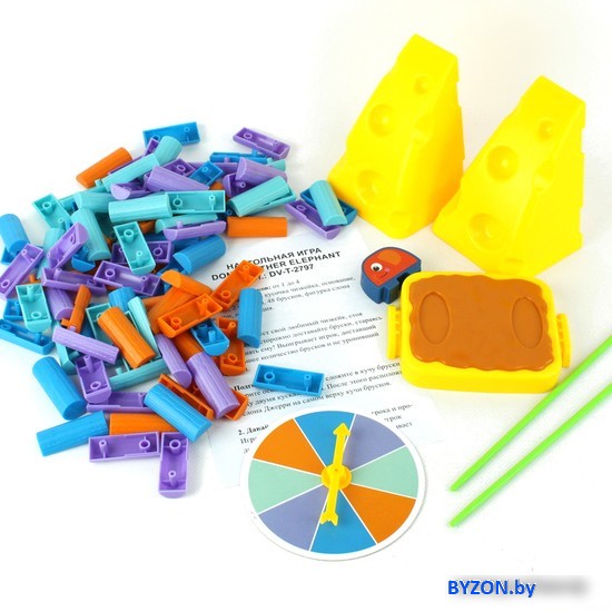 | Комплектация | основание, 2 кусочка сыра, рулетка, 2 палочки, фигурка слона, 48 брусков (состоят их 2-х частей) |