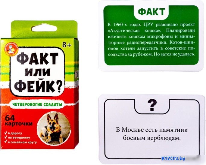 | Информация | Детская настольная игра для большой компании Факт или Фейк Четвероногие солдаты - это интересная игра в удобном формате, которую можно взять с собой на вечеринку, в гости или в дорогу. С этой игрой вы проверите уровень своих знаний о служебных собаках и интересно проведете время в компании. |