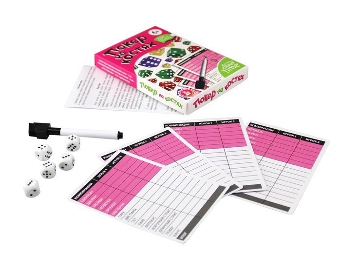| Комплектация | • маркер на водной основе – 1 шт. • ламинированная карточка для подсчета очков – 4 шт. (10х14 см.) кости игральные – 5 шт. • правила игры – 1 шт. |