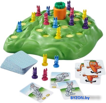 | Комплектация | 1 горка с морковкой, 16 зайчиков четырех цветов, 24 карточки прышков (действий), инструкция |