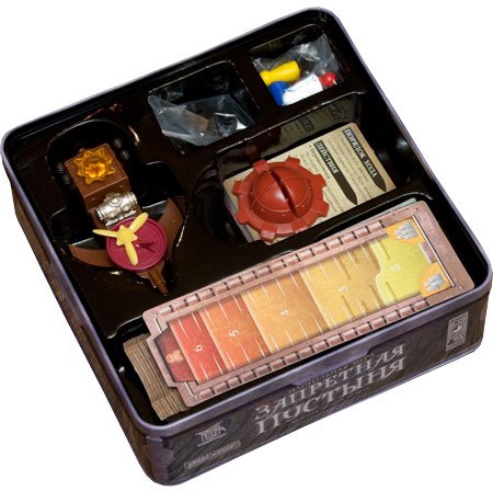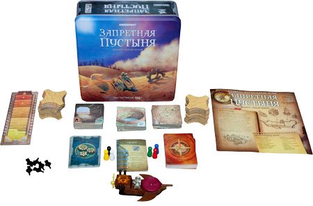 | Комплектация | 49 Карт (31 карта Бури, 12 карт Снаряжения, 6 карт Искателей приключений), 48 Песчаных маркеров, 24 Двусторонних участка Пустыни/Города, 6 Деревянных фишек, 6 Маркеров-скобок, 4 Детали летательного аппарата (навигационная палуба, мотор, солнечный кристалл, пропеллер), 1 Модель летательного аппарата, 1 Измеритель силы бури, 1 Подставка для Измерителя, правила игры на русском языке, жестяная коробка. |