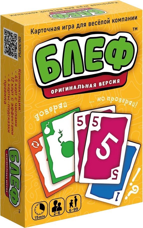 | Информация | - Эта увлекательная карточная игра станет отличным выбором для веселой компании друзей или семейного вечера. Она подходит как для новичков, так и для опытных игроков, ведь суть игры заключается в умении блефовать и разгадывать блеф других участников, что делает процесс еще более захватывающим. - Цель игры – сбросить все карты раньше остальных игроков. Блеф требует стратегии, интуиции и способности анализировать поведение соперников, а также развивает навыки актерского мастерства, ведь участникам придется притворяться, чтобы ввести других в заблуждение. - В игре используется колода из 57 карт, включающая 45 карт с цифрами и 12 специальных карт, которые могут кардинально изменить ход игры. Это добавляет элемент неожиданности и делает каждую партию уникальной. - Ориентировочное время одной партии составляет 10-15 минут, что позволяет быстро сыграть несколько раундов и насладиться игрой в компании. - Благодаря нескольким вариантам правил, игра будет интересна всем, независимо от уровня подготовки. Наслаждайтесь азартом и стратегией с "Нескучными играми Блеф"! |