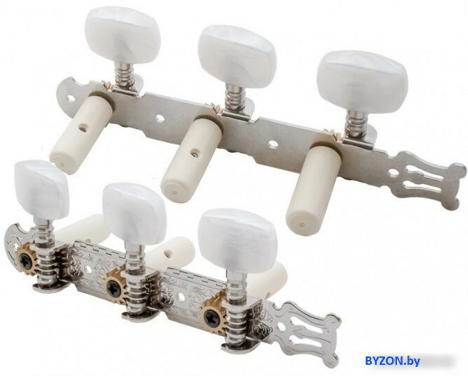 | Информация | Комплект колковой механики для классической гитары. Колки установлены на никелированную лиру, ручки выполнены из белого перламутрового пластика и имеют овальную форму. — передаточное число: 1:15; — расстояние между колками: 35 мм. |