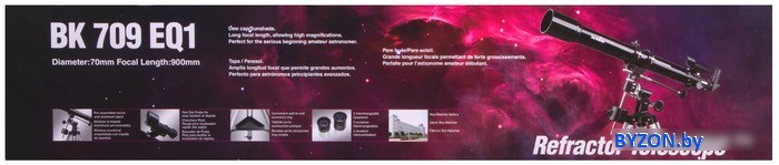 | Информация | Sky-Watcher Capricorn AC 70/900 EQ1 – ахроматический рефрактор для наблюдения ближнего космоса и наземных объектов. Этим телескопом очень легко управлять, он не требует сложной настройки и юстировки, поэтому понравится начинающим астрономам. Возможности оптики лучше всего подходят для исследования Луны и планет земной группы, но отдельные объекты дальнего космоса тоже можно рассмотреть, хотя и без особых деталей. В комплекте есть все необходимое для успешных наблюдений: окуляры, линза Барлоу, искатель с красной точкой, диагональное зеркало. Благодаря расширенной комплектации нет необходимости докупать какие-либо принадлежности, что опять же ценно для астрономов без опыта. Оптическая труба установлена на экваториальную монтировку EQ1. Она управляется вручную при помощи двух ручек тонкой настройки. Тренога сделана из алюминия и имеет регулировку по высоте. Есть лоток для аксессуаров. |