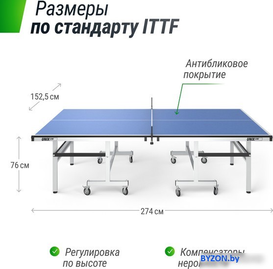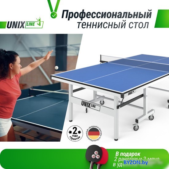 | Информация | ? Профессиональный теннисный стол UNIX Line сделан из МДФ толщиной 25 мм для отличного отскока мяча. ? Конструкция состоит из двух отдельных половин для удобства перемещения и компактного хранения. ? 8 прорезиненных колес 100 мм со стопорами обеспечивают мобильность и устойчивость. ? Боковые опоры стола регулируются по высоте для установки на неровной поверхности. ? Несущая рама выполнена из стальных труб с профилем 50х50 и 50х25 мм. ? Стол поставляется полностью собранным, остаётся лишь установить колеса. ? Система блокировки в сложенном состоянии для повышения безопасности во время хранения и транспортировки. ? Модель специально разработана для профессиональной игры в пинг-понг. ? В комплекте сетка из нейлона, 2 ракетки, 3 шарика в сумке. ?? Укрывной универсальный чехол для стола не входит в комплект и приобретается отдельно. |