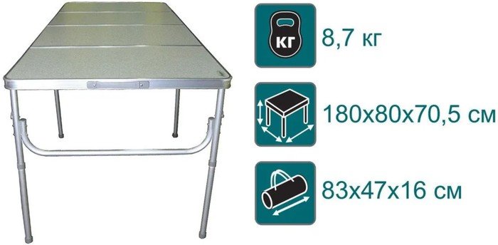 Код товара: 3924540 Рейтинг: 85 22| -4,89 стол, алюминий/МДФ, максимальная нагрузка 40 кг, сумка в комплекте, серый цвет, 180x80x70 см, 8.7 кг