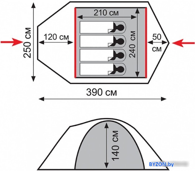 Код товара: 2511785 Рейтинг: 82 2| -70,55 треккинговая, весна/лето/осень, 4-местная, 2 входа, 1 комната, противомоскитная сетка, тамбур, штормовые оттяжки, ДхШхВ: 390x250x140 см