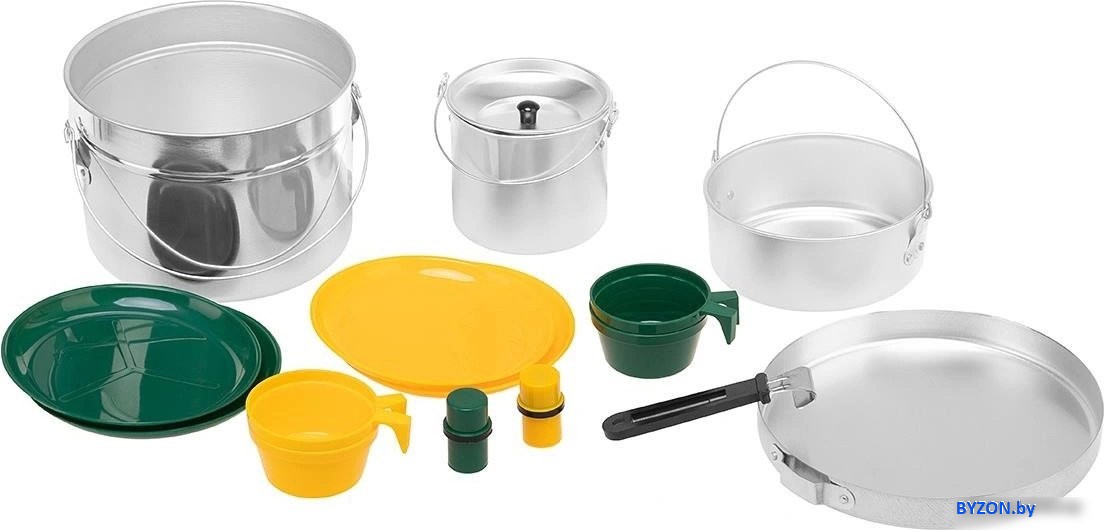| Состав набора | • Котелок (5,45 л) – 1 шт.; • Котелок (1,9 л) – 1 шт.; • Котелок (1,0 л) с крышкой – 1 шт.; • Сковорода со съемной ручкой – 1 шт.; • Тарелка – 4 шт.; • Кружка (240 мл) – 4 шт.; • Солонка – 1 шт.; • Перечница – 1 шт. |