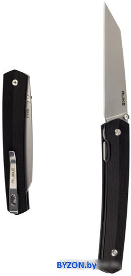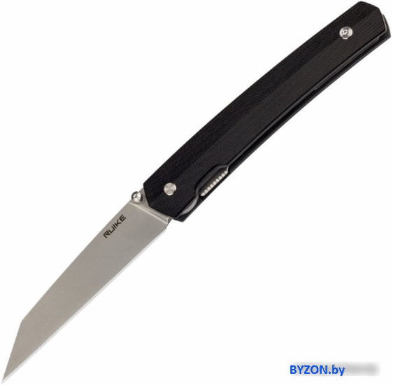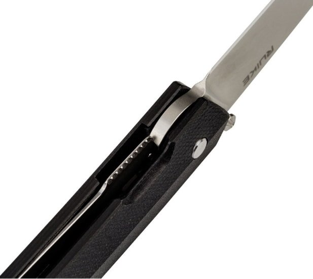 | Информация | Особенности:модель Ruike P865-B имеет складную конструкцию;нож открывается с помощью одностороннего шпенька;полная длина ножа в открытом положении — 20,5 см, в закрытом — 11,4 см;блокировка лезвия производится с помощью замка Liner-lock;форма клинка — Wharncliffe;режущая кромка по всей длине имеет гладкую заточку;нож имеет односторонний шпенек;длина клинка — 9,1 см;толщина лезвия в области обуха составляет 3,1 мм;для изготовления клинка применяется нержавеющая сталь марки 14C28N;лезвие было закалено до уровня 58-60 HRC;рукоять ножа состоит из нержавеющей стали марки 420 и полимерных накладок из G10;нож штатно укомплектован съемной стальной клипсой;вес модели Ruike P865-B составляет 70 грамм. |