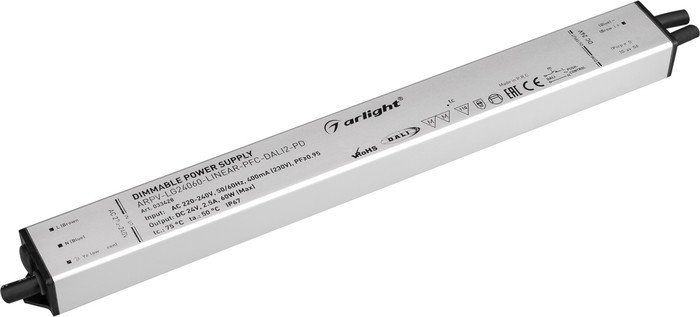 | Информация | Диммируемый блок питания 24V с гальванической развязкой, ток 2.5А, 60Вт, с управлением DALI, c функцией PUSH-DIM, с корректором мощности, PF0,95. Тонкий металлический корпус IP67. Вход: 220-240VAC. Выход: 24VDC, ШИМ 1кГц. Размер 290х30х21 mm.. Совместимость со стандартом EMC. Гарантия 5 лет. |