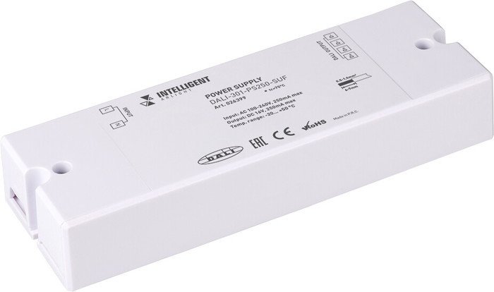 | Информация | источник питания для шины DALI, монтаж на поверхность, питание 100-240VAC, выход 16VDC 250mA |