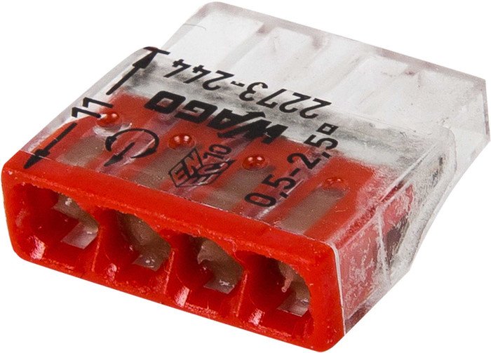 Код товара: 4284762 Рейтинг: 56 2| -50,31 ном. напряжение 450 В, ном. ток 25 А, корпус: полиамид, соединение: пружинный зажим, 4 точки, сечение одножильных проводников 0.5-2.5 кв.мм, с контактной пастой, 5 шт. в наборе, цвет: красный/прозрачный
