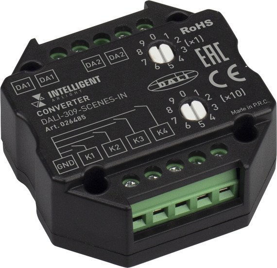 | Информация | Управляется внешними настенными выключателями, питание по шине DALI, выход - сигнал DALI, 4 сцены. Ручное выставление номера первой сцены. Размер 51х51х22 мм. |