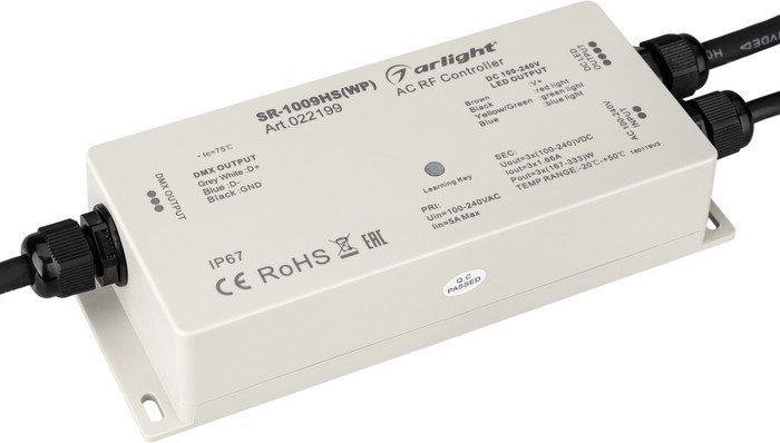 | Информация | Влагонепроницаемый (IP67) контроллер трехканальный для высоковольтной RGB ленты (гибкого неона 220В) или для ламп накал-я и галогенных на 220 В. DMX-выход для подключения доп. DMX-декодеров. Мощность макс. 1000 Вт (3 канала по 1,66А). Выход - триак (симистор). Управление с помощью пультов серии SR-2819x, SR-2833x или панелей SR-2830A, SR-2835DIM. Размер 180x74x38 мм. Питание 100-240VAC. |