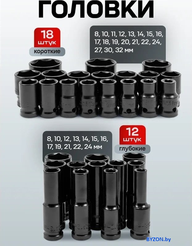 | Комплектация | 6-гранные головки, реверсивная трещотка, шарнирный вороток, удлинители, адаптеры |