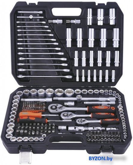 | Комплектация | Оснастка головки, насадки-биты, удлинители, кардан, магнитный держатель (1 шт.: 1/4"), держатель (3 шт.: 1/4"х1/4"(НЕХ), 1/2"х5/16"(НЕХ), 3/8"х5/16"(НЕХ)) Головки торцевые шестигранные, глубокие торцевые, торцевые Е-тип, свечные (3 шт.: 1/2"-16, 21 мм; 3/8"-18 мм), головки со вставкой Торцевые шестигранные головки 1/2? (15 шт.: 10-15, 17, 19-22, 24, 27, 30, 32 мм), 1/4? (13 шт.: 4, 4.5, 5, 5.5, 6-14 мм), 3/8? (10 шт.: 10-19 мм) Глубокие торцевые головки 1/2? (5 шт.: 16-19, 22 мм), 3/8? (6 шт.: 10-15 мм), 1/4? (7 шт.: 4-10 мм) Торцевые головки E-тип 1/2? (3 шт.: Е20, Е22, Е24 мм), 3/8? (6 шт.: Е10, Е11, Е12, Е14, Е16, Е18 мм), 1/4? (5 шт.: Е4, Е5, Е6, Е7, Е8 мм) Головки со вставкой шестигранные (Hex), звездочкой (Torx), звездочкой с отверстием (Torx) Насадки-биты шлицевые (SL), крестовые (PH), крестовые с насечками (PZ), шестигранные (Hex), звездочкой (Torx), звездочкой с отверстием (Torx), 12-гранные Spline, квадратные (Square Head), биты с двумя выступами, 3-лучевая Tri-Wing (TW), четырехлопастные Torq-Set Удлинители 1/2? (2 шт.: 125, 250 мм), 3/8? (1 шт.: 125 мм), 1/4? (2 шт.: 50, 100 мм) Кардан 1/2? (1 шт.), 3/8? (1 шт.), 1/4? (1 шт.) Ключи Ключи комбинированный (12 шт.: 8, 10-19, 22 мм), угловой шестигранный (7 шт.: 1.27, 1.5, 2, 2.5, 3-5 мм) Воротки T-образный (2 шт.: 1/2"-255 мм; 1/4"-150 мм) Инструменты Трещотка 1/2? (1 шт.: 255 мм), 3/8? (1 шт.: 200 мм), 1/4? (1 шт.: 155 мм) Отвертки отвертка-вороток (1 шт., 1/4") Доп. комплектация кейс |