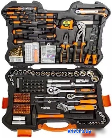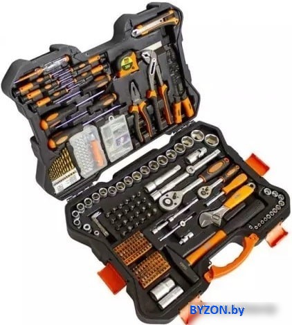 | Комплектация | 13шт. - 1/4"Головки: 4, 4.5, 5, 5.5, 6, 7, 8, 9, 10, 11, 12, 13, 14мм 18шт. - 1/2"Головки: 10, 11, 12, 13, 14, 15, 16, 17, 18, 19, 20, 21, 22, 23, 24, 27, 30, 32мм 1шт. - 1/4"Трещотка реверсивная 1шт. - 1/4"Т-образный вороток 2шт. - 1/4"Удлинители: 50, 100мм 1шт. - 1/4"Кардан шарнирный 1шт. - 1/4"Рукоятка 150мм 1шт. - Битодержатель 1/4"(F) x 1/4"(F) 25мм 1шт. - 1/2"Трещотка реверсивная 2шт. - 1/2"Удлинители: 125, 250мм 1шт. -1/2 Адаптер с отверстием 1шт. - 1/2"Кардан шарнирный 2шт. - 1/2"Свечные головки: 16, 21мм 1шт. -Битодержатель 1/2""(F)x5/16""(F) 24шт. -Биты 5/16"х 30мм: "SL: 5.5-6.5-7-8мм PH: 3-4 PZ: 3-4 H: 5.5-6.5-7-8мм M: 5-6-8-10 T:25-27-30-35-40x2-45-50" 1шт. - Ключ разводной 8" 1шт. - Молоток 300гр. 1шт. - Клещи для снятия изоляции и обжимки клемм 9" 1шт. - Комбинированные пассатижи 7" 1шт. - Переставные пассатижи 10" 1шт. - Нож универсальный 10шт. - Лезвия для ножа в чехле 1шт. - Рулетка 3м х 16мм "4шт. - Отвертки: SL: 4x100, 6.5x125мм PH: 1 x 80, 2 x 100мм" "5шт. - Отвертки для точных работ: SL: 2.5-3.0мм PH: 0-00-000" 1шт. - Отвертка индикаторная 7шт. - Набор ключей Г-образных HEX: 1.27, 1.5, 2, 2.5, 3, 4, 5мм "30шт. - Набор бит для точных работ H4мм: PH: 000-00-0-1-2 SL: 1.5-2-2.5-3-4мм T: 4-5-6-8-9-10 Y: 2-3 TA:2-2.3 H: 1.5-2-2.5-3-3.5-4мм SP: 2.3мм TS: 1-4-5 1шт - Удлинитель-битодержатель 100мм 1шт - Рукоятка-битодержатель 100мм" "100шт - Биты 25мм: SL: 3-4-4.5-5-5.5-6-6.5-7-8мм C:1-2-3 S: 0-1-2-3 Torg: 6-8-10мм M: 5-6-8 T: 8-10-15-20-25-27-30-35-40-45 SP: 4-6-8-10мм tri wing: 1-2-3-4 PH: 0x2-1X2-2X4-3X2 PZ0x2, PZ1x2, PZ2x4, PZ3x2 T hole: 8H-10H-15H-20H-25H-27H-30H-35H-40H H: 1.5, 2, 2.5, 3, 4, 5, 5.5, 6, 8мм H hole: 2-2.5-3-4-5-6-5/64-3/32-7/64-1/8-9/64-5/32 H: 1/16-5/64-3/32-7/64-1/8-9/64-5/32-3/16-7/32-1/4""" 13шт. - Сверла по металлу : 1.5, 2.0, 2.5, 3.0, 3.2, 3.5, 4.0, 4.5, 4.8, 5.0, 5.5, 6.0, 6.5мм 54шт. - Набор крепежа 1шт. - Пластиковый кейс |