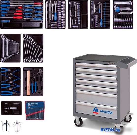 | Комплектация | Модуль 1 Набор отверток, съемник клипс и гибкий магнит, 19 предметов 9-31919MR Модуль 2 Набор торцевых головок 1/2" с принадлежностями, 33 предмета 9-4333MR03 Набор торцевых головок 3/8" с принадлежностями, 23 предмета 9-3523MR Модуль 3 Набор ударных головок 1/2" и торцевых головок 1/4" с принадлежностями, 40 предметов 9-7540MR Набор торцевых насадок, шестигранники Г-образные и разрезные ключи, 31 предметов 9-90131MR Модуль 4 Набор накидных ключей, 11 предметов 9-1711MR Набор комбинированных ключей, 16 предметов 9-1216MR03 Модуль 5 Набор переставные клещи, разводной ключ и молоток, 3 предмета 9-90103PP02 Набор съемников стопорных колец, пассатижей и бокорезов, 7 предметов 9-40207GP Модуль 6 Набор отвертка ударная 5/16" с принадлежностями, 6 предметов 9-4128FR Вспомогательный инструмент Набор выколоток, бородков, кернеров, 10 предметов 1010PR Съемник подшипников 2-х захватный 100 мм 7962-04 Съемник подшипников 3-х захватный 100 мм 7963-04 Тележка инструментальная 7 выдвижных полок, цвет синий Количество предметов: 204 Количество ложементов: 10 Размеры тележки в сборе: 460 х 680 х 955 мм Упаковка: картон Вес: 86,7 кг |