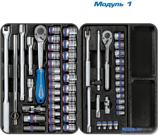 | Комплектация | Модуль 1 Набор торцевых головок 1/2" с принадлежностями 9-4333MR03 33 Набор торцевых головок 3/8" с принадлежностями 9-3523MR 23 Модуль 2 Набор ударных головок 1/2" и торцевых головок 1/4" с принадлежностями 9-7540MR 40 Набор торцевых насадок, шестигранники Г-образные и разрезные ключи 9-90131MR 31 Модуль 3 Набор комбинированных ключей 9-1216MR03 16 Набор накидных ключей 9-1711MR 11 Модуль 4 Набор отверток, съемник клипс и гибкий магнит 9-31919MR 19 Модуль 5 Набор съемников стопорных колец, пассатижей и бокорезов 9-40207GP 7 Набор переставные клещи, разводной ключ и молоток 9-90103PP02 3 Модуль 6 Набор отвертка ударная 5/16" с принадлежностями 9-4128FR 10 Набор выколоток, бородков, кернеров 1010PR 10 Съемник подшипников 3-х захватный 100 мм 7963-04 1 Съемник подшипников 2-х захватный 100 мм 7962-04 1 Технические характеристики Материалы – инструментальные стали Cr-V, Cr-Mo, SNCM+V (S2), конструкционная сталь, хром, пластики PP, вспененный PVC, PP+TPR (рукояти отверток, трещоток, шарнирно-губцевого инструмента), дерево (рукоять молотка), PVC (ложемент) Размеры упаковки – 575 ? 540 ? 420 мм Вес – 31,7 кг |
