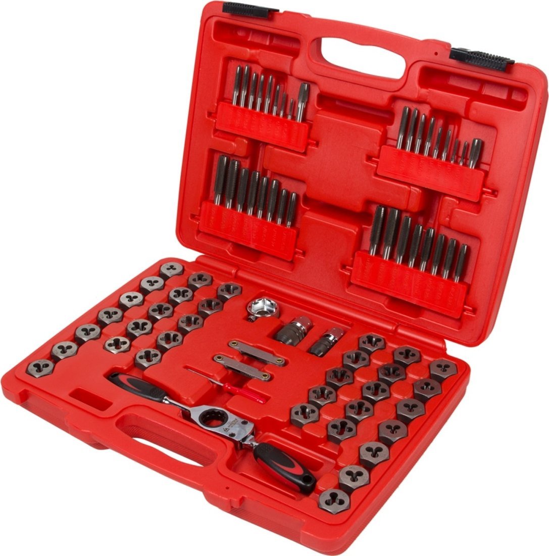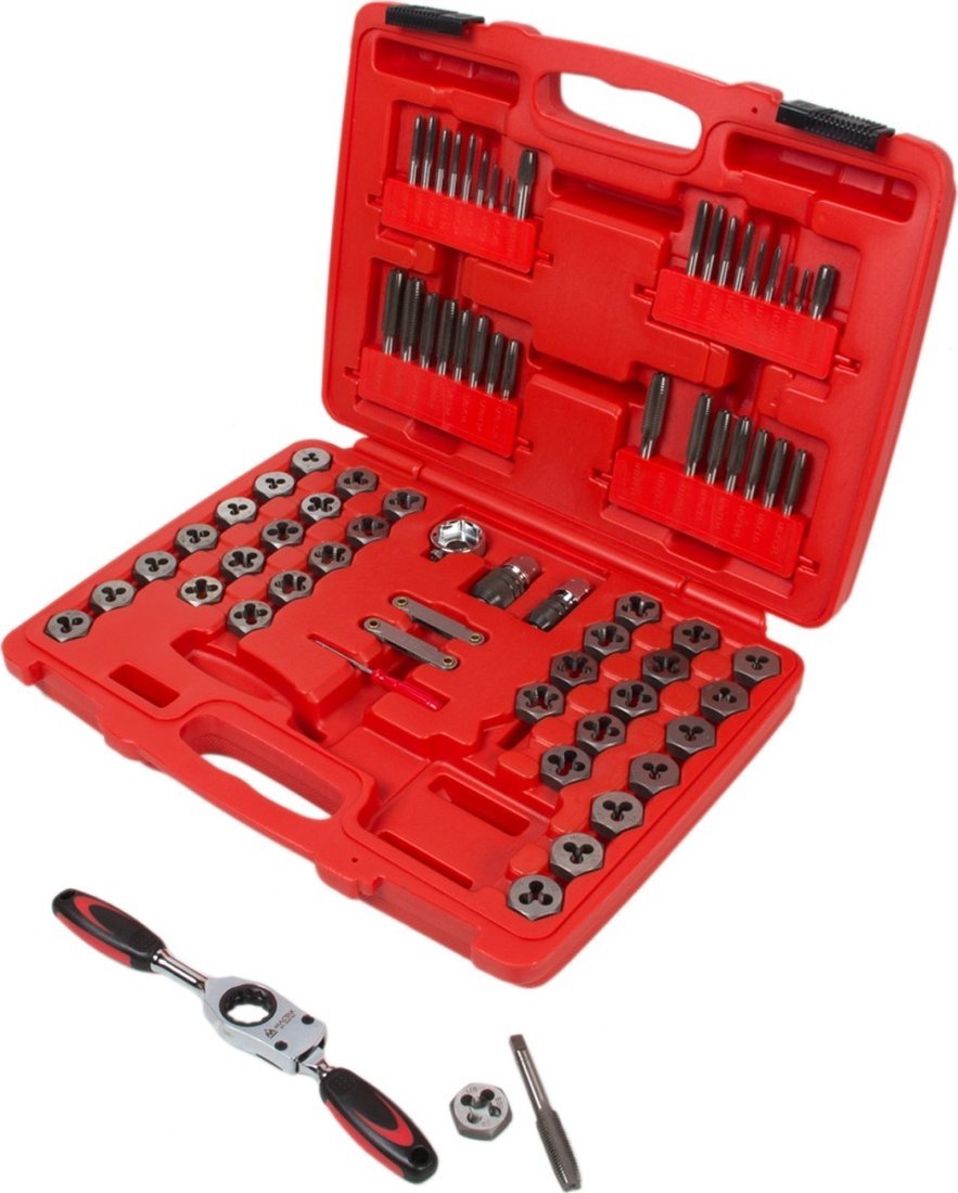 | Комплектация | метчики и плашки метрические и дюймовые, ключ трещоточный, метчикодержатели, плашкодержатель, резьбомер, отвертка |