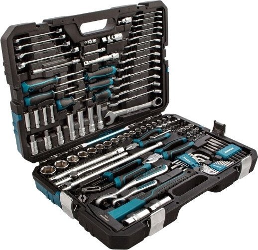 | Комплектация | Инструменты в наборе трещотка (2 шт.), отвертка (6 шт.), клещи (1 шт.), плоскогубцы (1 шт.), молоток (1 шт.), выколотка (1 шт.), зубило (1 шт.), бокорезы (1 шт.), ключ гаечный (38 шт.) Трещотка 1/2?, 1/4? Отвертки шлицевая (SL) (3 шт.), крестовая (PH) (3 шт.) Доп. комплектация кернер (1 шт.), кейс (пластиковый), бородок (1 шт.), крейцмейстер (1 шт.) Оснастка Оснастка головки, удлинители (5 шт.), кардан (2 шт.) Головки торцевые шестигранные (30 шт.), свечные (2 шт.), головки со вставкой (14 шт.), удлиненные шестигранные (8 шт.) Торцевые шестигранные головки 1/2? (8, 9, 10, 11, 12, 13, 14, 15, 16, 17, 18-22, 24, 27, 30, 32 мм), 1/4? (4, 4.5, 5, 5.5, 6, 7, 8, 9, 10, 11, 12, 13 мм) Головки со вставкой шестигранные (Hex) (Н4, Н5, Н6, Н7, Н8, Н10, Н12, Н14, Н17), звездочкой (Torx) (Т10, Т15, Т20, Т25, Т27) Удлинители 1/2? (125, 250 мм), 1/4? (75 мм), гибкий удлинитель (1/4") Кардан 1/2? (12.7 мм), 1/4? (6.35 мм) Ключи Ключи вороток (4 шт.), комбинированный (14 шт.), разрезной (4 шт.), имбусовый (16 шт.) Воротки T-образный Размер ключа 8 мм, 10 мм, 11 мм, 12 мм, 13 мм, 14 мм, 15 мм, 17 мм, 16 мм, 19 мм, 1.5 мм, 2 мм, 2.5 мм, 3 мм, 4 мм, 5 мм, 6 мм, 21 мм |