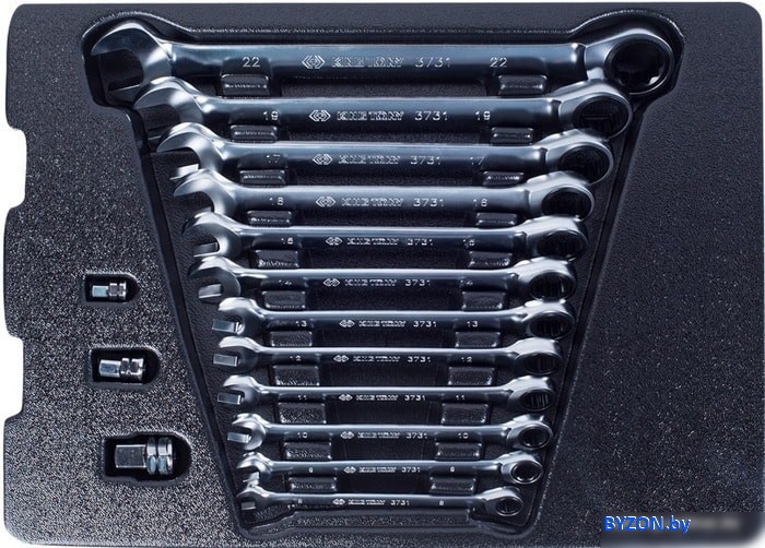 | Комплектация | Ключ трещоточный комбинированный: 8, 9, 10, 11, 12, 13, 14, 15, 16, 17, 19, 22 ммПереходник для трещоточных ключей: 1 штПереходник для трещоточных ключей 13 мм для головок 3/8": 1 штПереходник для трещоточных ключей 19 мм для головок 1/2": 1 шт |