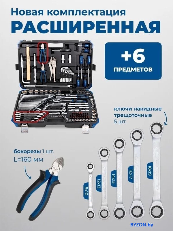 | Комплектация | Посадочный квадрат 1/4": 9x 1/4" DR. Головка 6-гранная: 4, 4.5, 5, 5.5, 6, 7, 8, 9, 10 мм 5x 1/4" DR. Головка E-профиль: E4, E5, E6, E7, E8 3x 1/4" DR. Удлинитель: 2", 4", 6" 1x 1/4" DR. Трещотка 72зуб 1x 1/4" DR. Адаптер 3/8" (F) x 1/4" (M) 1x 1/4" DR. Кардан шарнирный 1x 1/4" DR. рукоятка для головок 1x 1/4" DR. Гибкий удлинитель Биты: 26x 5/16" DR. Биты: H7, H8, H10, H12, H14; T30, T40, T45, T50, T55, T60; SL8, SL10, SL12; PH2, PH3, PH4; PZ2, PZ3, PZ4; M5, M6, M8, M10, M12, M14 Посадочный квадрат 3/8": 15x 3/8" DR. Головка 12-гранная: 6, 7, 8, 9, 10, 11, 12, 13, 14, 15, 17, 18, 19, 21, 22 мм 1x 3/8" DR. Трещотка шарнирная 72зуб 1x 3/8" DR. Кардан шарнирный 2x 3/8" DR. Удлинитель: 3" и 6" Посадочный квадрат 1/2": 15x 1/2" DR. Головка 6-гранная: 8, 10, 12, 13, 14, 15, 16, 17, 18, 19, 21, 22, 23, 24, 25 мм (CR-Mo: 17, 19, 21 мм) 4x 1/2" DR. Головка 12-гранная: 27, 30, 32, 36 мм 5x 1/2" DR. Головка E-профиль: E10, E12, E14, E16, E20 2x 1/2" DR. Удлинитель: 3" и 10" 1x Адаптер: 3/8" (F) x 1/2" (M) (CR-MO) 2x 1/2" DR. Головка для свечей: 16 мм и 21 мм 1x 1/2" DR. Трещотка 72зуб 1x 1/2" DR. Кардан шарнирный 1x Вороток шарнирный 430 мм 1x Вороток Г-образный 250 мм 1x 1/2" DR. Битодержатель Другие инструменты: 17x Комбинированный ключ: 6, 7, 8, 9, 10, 11, 12, 13, 14, 15, 16, 17, 18, 19, 21, 22, 24 мм 1x Молоток 300 г 5x Ключи разрезные: 8x10, 10x12, 11x13, 12x14, 17x19 мм 1x Комбинированные плоскогубцы 180 мм 1x Бокорезы 160 мм 5x Ключи накидные с трещоткой: 8x10, 12x13, 14x15, 16x17, 18x19 мм 10x Шестигранный ключ: 2.5, 3, 4, 5, 6, 7, 8, 10, 12, 14 мм 6x Набор отверток: PH1x38, PH2x100, PH2x150, SL5.5x38, SL6.5x100, SL6.5x150 мм 1x Зажим гейферный 250 мм |