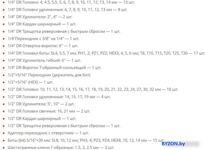 | Комплектация | 1/4" DR Головки: 4, 4.5, 5,5. 5, 6, 7, 8, 9, 10, 11, 12, 13, 14 мм — 13 шт. 1/4" DR Головки удлиненные: 6, 7, 8, 9, 10, 11, 12, 13 мм — 8 шт. 1/4" DR Удлинители: 2", 4" — 2 шт. 1/4" DR Кардан шарнирный — 1 шт. 1/4" DR Трещотка реверсивная с быстрым сбросом — 1 шт. 1/4"Переходник с 3/8" на 1/4" — 1 шт. 1/4" DR Отвертка-вороток: 6" — 1 шт. 1/4" DR Головки-биты: SL4, 5.5, 7 мм; PH1, 2; PZ1, PZ2; HEX3, 4, 5, 6 мм; T8, T10, T15, T20, T25, T30 — 17 шт. 1/4" DR Удлинитель гибкий: 6" — 1 шт. 1/4" DR Вороток Т-образный скользящий — 1 шт. 1/2"?5/16" Переходник (держатель для бит) 1/2"?5/16" (HEX) — 1 шт. 1/2" DR Головки: 10, 11, 12, 13, 14, 15, 16, 17, 18, 19, 20, 21, 22, 23, 24, 27, 30, 32 мм — 18 шт. 1/2" DR Головки удлиненные: 14, 15, 17, 19 мм — 4 шт. 1/2" DR Удлинители: 5", 10" — 2 шт. 1/2" DR Головки свечные: 16, 21 мм — 2 шт. 1/2" DR Кардан шарнирный — 1 шт. 1/2" DR Трещотка реверсивная с быстрым сбросом — 1 шт. Адаптер-переходник с отверстием — 1 шт. Биты (bit) 5/16"?30 мм: SL8, 10, 12 мм; PH3, 4; PZ3, PZ4; HEX8, 10, 12, 14 мм — 15 шт. Шестигранные ключи Г-образные: 1.5, 2, 2.5 мм — 3 шт. |