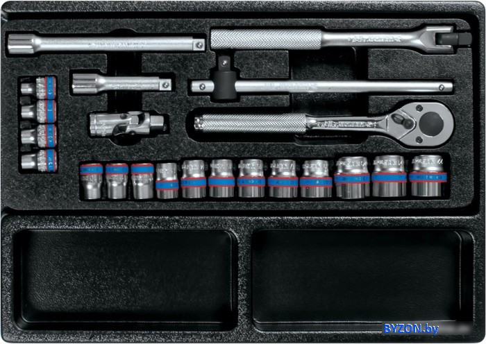 | Комплектация | - Головка торцевая стандартная шестигранная 3/8", KING TONY серии 3335M: 6, 7, 8, 9, 10, 11, 12, 13, 14, 15, 16, 17, 19, 20, 21, 22; - Трещотка 3/8", 200 мм, 32 зубца, флажковая KING TONY 3769-08F; - Вороток 3/8", 200 мм, скользящий KING TONY 3571-08; - Удлинитель 3/8", KING TONY серии 3221: 75, 150; - Вороток 3/8", 250 мм, с шарниром KING TONY 3452-10F; - Кардан 3/8" KING TONY 3792. - Ложемент |
