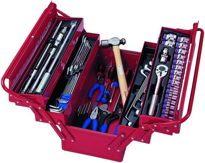| Комплектация | Отсек 1, Набор торцевых головок KING TONY 9-4319MRГоловки и принадлежности 1/2" (12,7 мм):Головки торцевые стандартные 6-гранные: 10, 11, 12, 13, 14, 15, 16, 17, 18, 19, 20, 21, 22, 23, 24, 27, 30, 32 ммТрещотка серии 4768-10F длина 250 мм, 32 зубца, флажковый механизм переключения реверса, насечка на рукояткеКардан: длина 77,5 ммОтсек 2, Набор принадлежностей для торцевых головок KING TONY 9-4116FRПринадлежности 1/2" (12,7 мм):Вороток с шарниром: длина 450 ммВороток скользящий (ползунок): длина 300 ммГоловка свечная шестигранная: 21 мм, длина 70 мм, резиновый фиксаторУдлинители: длина 125 и 250 ммУдлинители: длина 50 мм, шаровый наконечник 15 градусовОтсек 3, Набор накидных ключей KING TONY 9-1716MRКлючи накидные: 8x9, 10x11, 12x13, 14x15, 16x17, 18x19 ммОтсек 4, Набор рожковых ключей и шестигранников KING TONY 9-90115MRКлючи рожковые: 6x7, 8x10, 11x13, 12x13, 17x19, 22x24 ммНабор Г-образных шестигранников с шаровым окончанием KING TONY 20109MR шестигранники: 1.5, 2, 2.5, 3, 4, 5, 6, 8, 10 ммОтсек 5Отвертки крестовые Phillips: №1 х 80 мм, №2 х 38 мм, №3 х 150 ммОтвертки шлицевые Slotted: 5.5 х 100 мм, 6.5 х 38 мм, 8 х 175 ммПлоскогубцы комбинированные: длина 175 ммПлоскогубцы тонконосые: длина 160 ммЗахват переставной: длина 250 ммКлюч разводной Chrome: длина 200 ммМолоток круглый: вес 454 гЗубила: 17 x 150 мм, 23 x 200 ммВыколотки: 3x40 мм, 4x50 мм, 5x55 мм, 6x55 ммКернер: 4 x 120 мм |