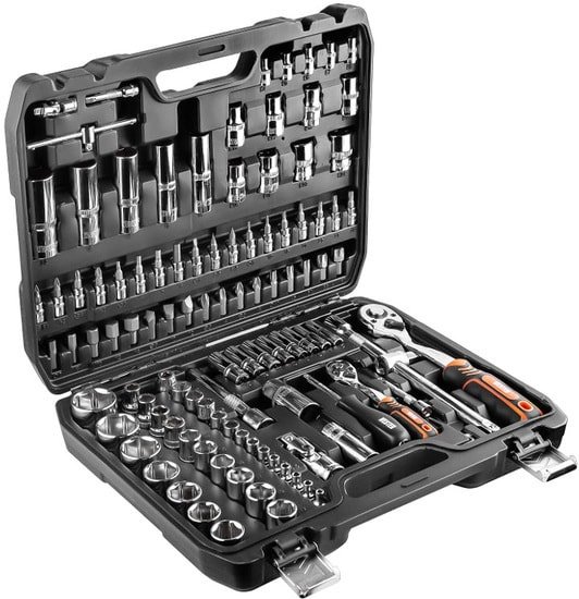 | Комплектация | - Головки-биты 1/4" : SL4, SL5.5, SL6.5, PH1, PH2, PZ1, PZ2, HEX:3, 4, 5, 6, T8, T10 , T15, T20, T25 T,27, T30- Торцевые головки 1/4" 6 граней : 4, 4.5, 5, 5.5, 6, 7, 8, 9, 10, 11, 12, 13, 14 мм- Головки торцевые 1/4" глубокие, 6 граней: 6, 7, 8, 9, 10, 11, 12, 13 мм- Удлинители 1/4": 50 мм, 75 мм- Кардан 1/4" 35 мм- Трещотка 1/4" 72 зуба- Головки торцевые 1/4" Torx: E4, E5, E6, E7, E8- Вороток Т-образный 1/4"- Отвертка - держатель 1/4" 150 мм- Головки торцевые 1/2" 6 граней : 10, 11, 12, 13, 14, 15, 16, 17, 18, 19,20, 21, 22, 24, 27, 30, 32 мм- Головки торцевые 1/2" глубокие, 6 граней: 14, 15, 17, 19, 22 мм- Удлинители 1/2": 120, 250 мм- Кардан 1/2" 70 мм- Головки торцевые 1/2" Torx: E10, E11, E12, E14, E16, E18, E20, E24- Трещотка 1/2" 72 зуба- Свечные головки 1/2": 16 мм , 21 мм- Адаптер для воротка- Ключи шестигранные Г-образные : 1.5, 2, 2.5 мм- Биты L=25 мм: SL8, SL10, SL12, T40, T45, T50, T55, T60, PH3, PH4,PZ3, PZ4, HEX: 7, 8, 10, 12, 14 мм |