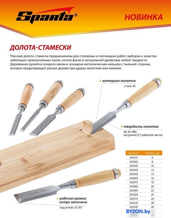 | Информация | - Плоское долото-стамеска с деревянной рукояткой идеально подходит для столярных и плотничных работ. С его помощью вы сможете легко выполнять выборку и зачистку небольших прямоугольных пазов, а также снимать фаски с древесины любой твердости. - Полотно стамески изготовлено из конструкционной стали 45 и обладает острозаточенной кромкой, что обеспечивает высокую эффективность работы. Твердость инструмента на длине 0,7 рабочей части полотна составляет 45–55 HRC, что гарантирует долговечность и надежность. - Рукоятка стамески имеет защитное лакокрасочное покрытие, что обеспечивает комфортный захват и защиту от повреждений. Металлическое кольцо на тыльной стороне рукоятки предотвращает раскол дерева при ударах молотком или киянкой, что делает работу более безопасной и эффективной. - Этот инструмент станет незаменимым помощником для профессионалов и любителей, которые ценят качество и надежность в своих проектах. |
