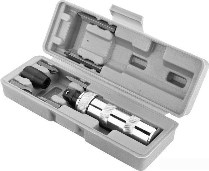 | Информация | Ударная отвертка с набором бит в кейсе DEKO TZ7 (7 предметов) служит для откручивания сильно закрученных винтов при помощи ударов по обратной стороне отвертки.Комплект поставляется в компактном пластиковом кейсе.В наборе идут биты 65мм:PH3,SL6 и 35мм:PH3,PH2,SL8,SL6. |