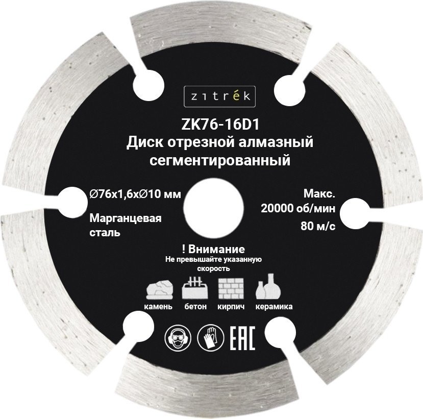 | Информация | Диск отрезной алмазный сегментированный Zitrek ZK76-16D1, 76x1,6x10мм, 1,6мм предназначен для использования с УШМ при отрезных работах по бетону, кирпичу и керамике. |