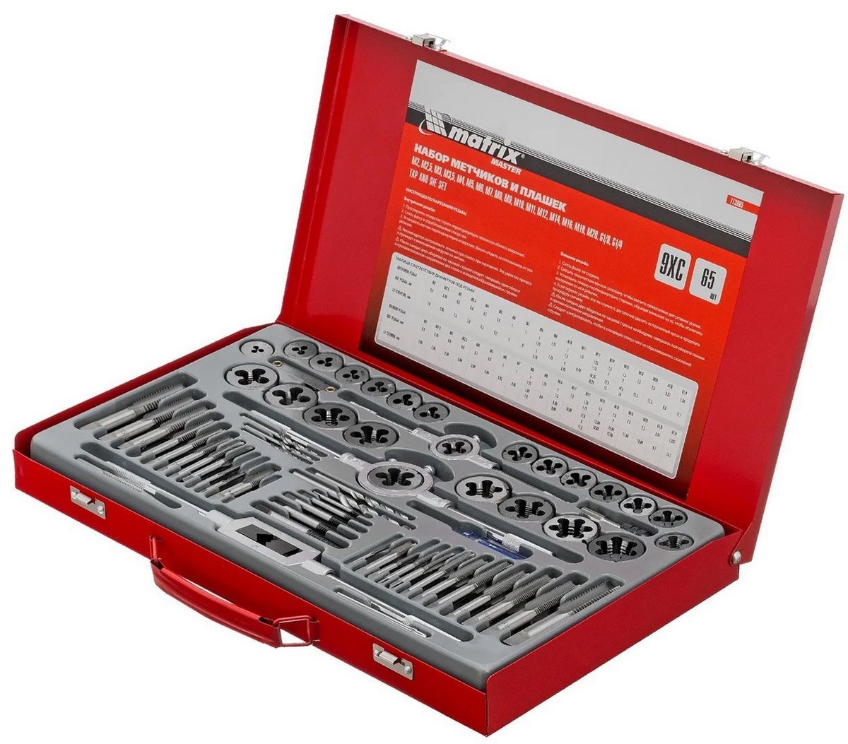 | Информация | - Набор метчиков и плашек Matrix 773065 — это идеальное решение для создания внутренней и внешней резьбы различных диаметров и шагов. В комплекте 65 предметов, которые удобно размещены в прочном металлическом кейсе. Этот набор станет незаменимым помощником как для профессионалов, так и для любителей слесарных работ, включая ремонт автомобилей. - Высокие режущие свойства обеспечиваются легированной сталью 9ХС, закаленной до твердости 59-62 HRC. Это гарантирует долговечность и эффективность резьбонарезных инструментов. В набор входят метчики и плашки для нарезания трубной резьбы G1/8 и G1/4, что расширяет возможности использования. - Для точного расположения отверстий предусмотрен кернер, который поможет сделать разметку под первичную установку сверла. Удобный Т-образный вороток увеличивает крутящий момент и облегчает работу в ограниченных пространствах, что делает процесс нарезки резьбы более комфортным. - Контроль качества выполненных работ обеспечивается резьбомером, который позволяет оценить соответствие полученной резьбы заданным параметрам. Боковые винты плашкодержателей надежно фиксируют плашки, а увеличенное число зубьев на калибрующей части плашек обеспечивает точность внешней резьбы. - Быстрый поиск нужного инструмента облегчается благодаря маркировке на метчиках и плашках, где указаны шаг и размер резьбы. Прочный металлический кейс с надежными защелками и ручкой обеспечивает удобное хранение и транспортировку набора. |