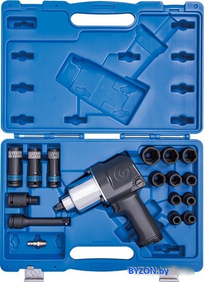 | Комплектация | – Гайковёрт пневматический ударный (арт. 33411-050) – Головки ударные короткие 9, 10, 11, 13, 14, 17, 19, 22, 24, 27 мм (серия 4535M) – Головки ударные глубокие тонкостенные 17, 19, 21 мм (серия 4415M) – Удлинитель ударный 125 мм (4260-05P) – Карда |