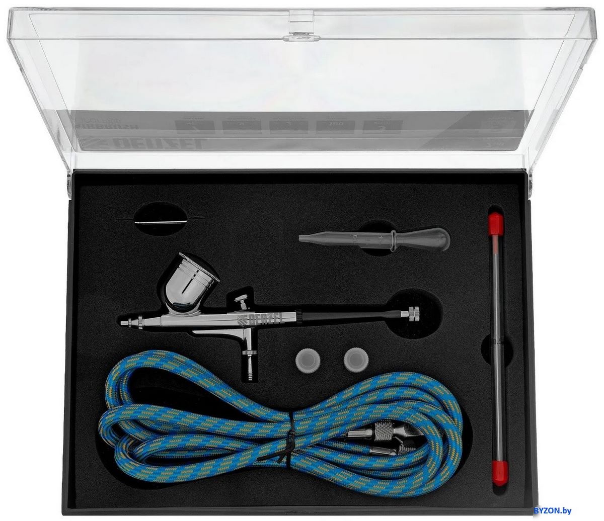 | Комплектация | - Аэрограф; - Дозатор; - Шланг для аэрографа; - Набор сменных сопел; - Гаечный ключ; - Набор сменных игл; - Кейс; - Руководство по эксплуатации и гарантийный талон; |