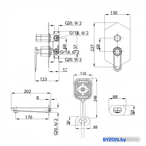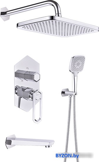 | Комплектация | верхний душ, ручной душ (лейка), держатель лейки, шланг, смеситель, излив для ванны |