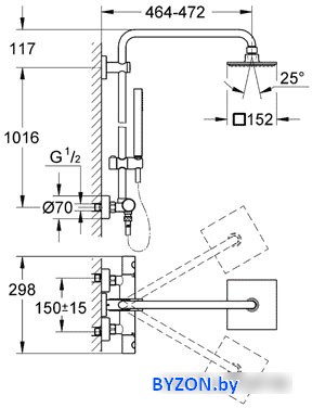 | Диаметр (ширина) верхнего душа | 152 мм |