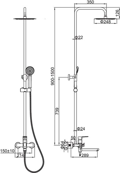 | Комплектация | верхний душ, штанга, ручной душ (лейка), держатель лейки, шланг, смеситель, излив для ванны |