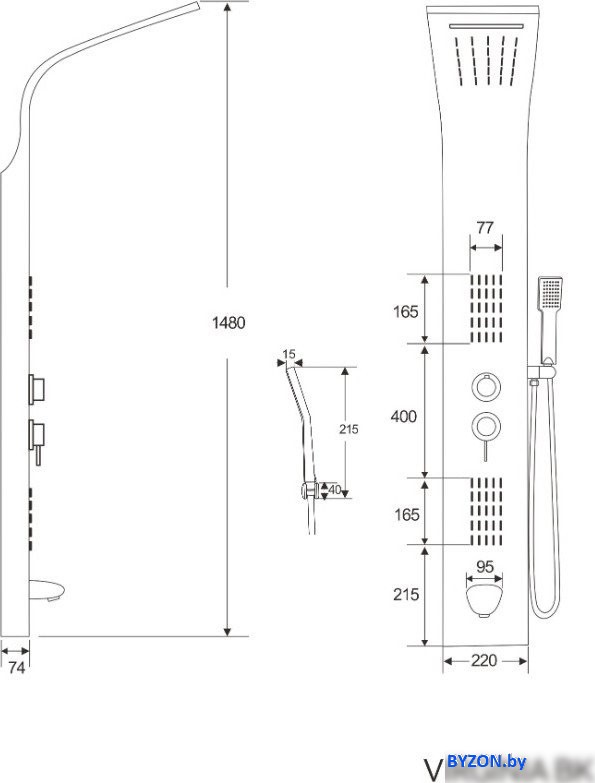 | Комплектация | верхний душ, ручной душ (лейка), держатель лейки, шланг, смеситель, излив для ванны |